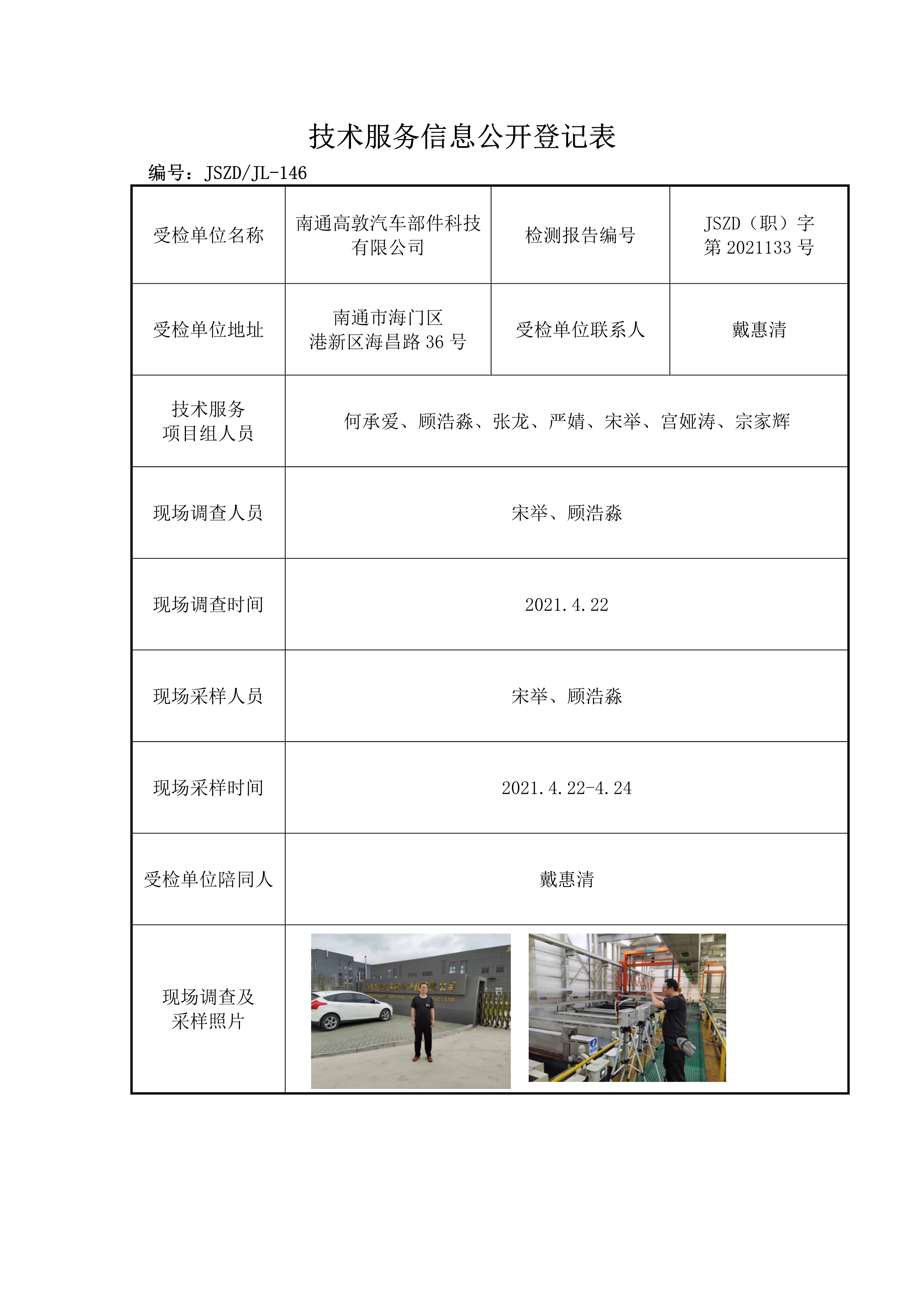 2021-2022南通地區(qū)檢驗檢測項目公開——正大JSZD(職)字第2021133號南通高敦汽車部件科技有限公司職業(yè)病危害因素檢測報告